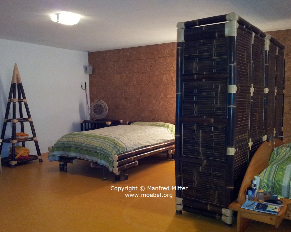 Hier am Foto ein freistehender Bambusschrank "mit echtem Rücken", also auch hinten mit Sichtseite (notwendig deshalb, weil nicht an der Wand stehend und daher ist der Schrank auch von hinten sichtbar - siehe auch Foto Schrank Rückseite). In solchen Fällen muss beim Kasten nicht nur seitlich die Wand doppelt sein, sondern auch hinten (diese Bambuslamellen vom schwarzen Bambus sind ja nur auf einer Seite schwarz, die andere ist hell).