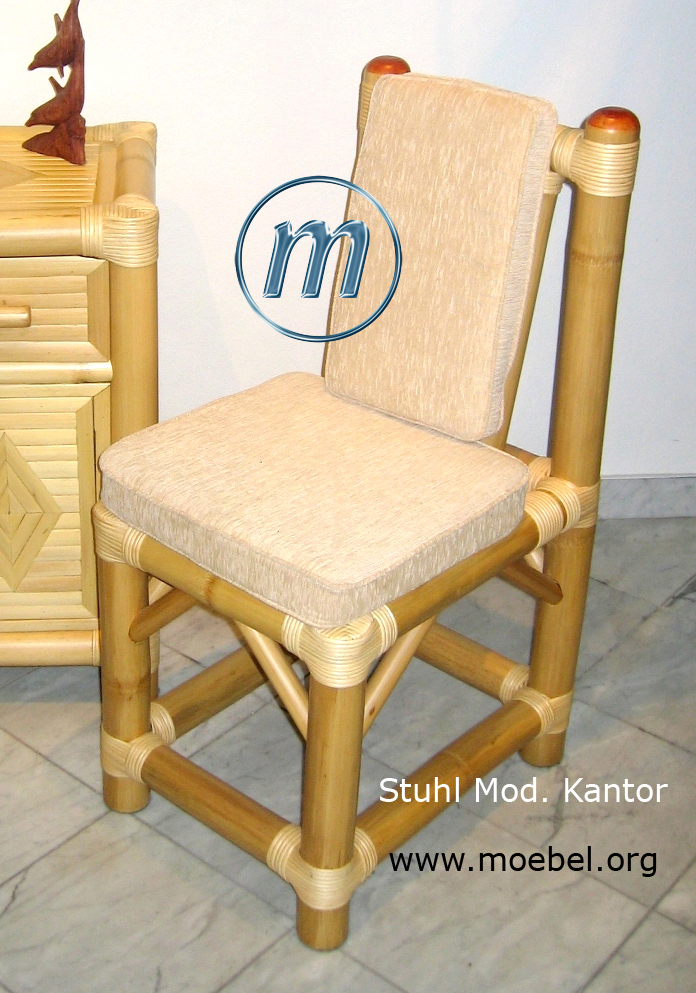 Ein eher zierlich gebauter Stuhl für Schreibtische im Büro, Arbeitszimmer oder Kinderzimmer aber auch für Tische im Wintergarten oder im Esszimmer. Nach hinten geneigte Rückenlehne für guten Sitzkomfort, ein robuster Sessel aus hellem oder aus schwarzem Bambus und auch nach Wunsch gebeizt. Sauber verarbeitete Rattanwicklungen und handgedrechselte Holzkappen an der Lehne oben.