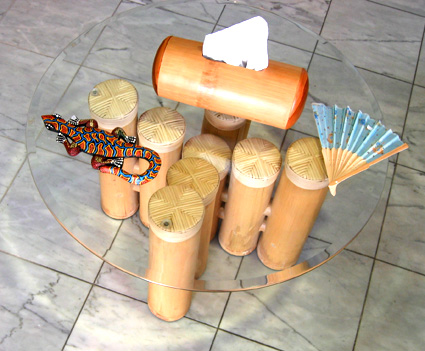 Tisch bestehend aus 9 Bambusrohren - die mit eleganter Rattanwicklung verschlossen sind - und Glasplatte, ideal für Ihr Wohnzimmer, für Ihr Kinderzimmer oder für Ihren Wintergarten