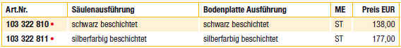 Höhe: 750 mm Säule Abmessung: ø 40 mm Bodenplatte Abmessung: Bodenplatte ø 280 mm, mit Filzauflagen Fußstütze Abmessung: ø 370 mm Anschraubteil Abmessung: 225 x 120 mm Gewicht (kg): 11