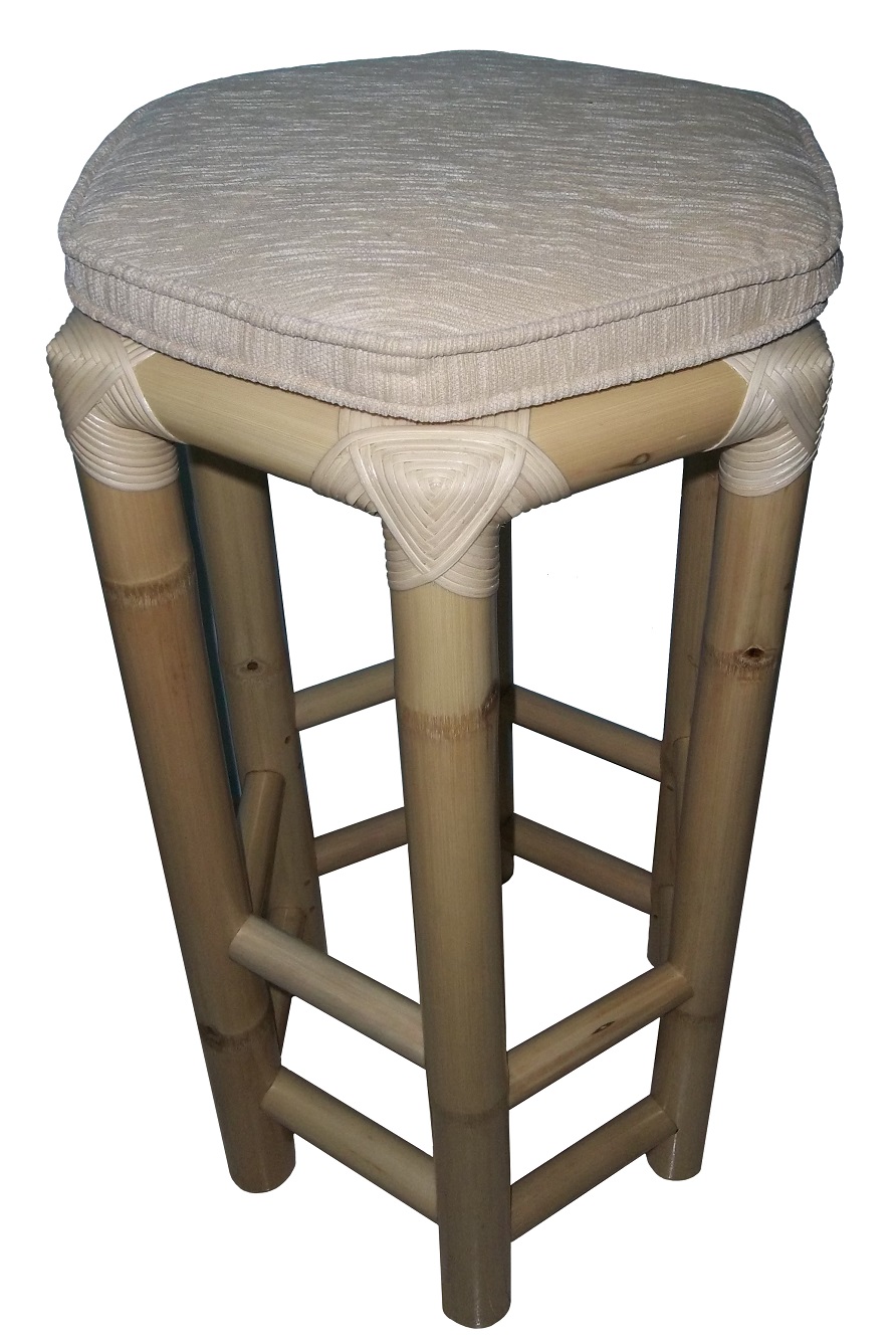Barhocker aus Bambusrohr, ohne Lehne, Bambus hell oder dunkel, mit Rattan-Wicklungen, transparent lackiert. Sitz gepolstert, Stoff ist abziehbar zum Waschen (Reißverschluss).