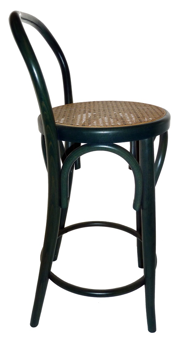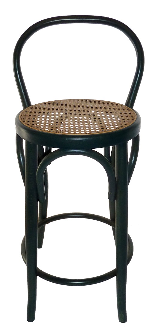<strong>Barhocker / Tresenhocker</strong> aus gebogenem Holz (dunkelgrün gebeizt und transparent lackiert) mit Geflecht im Sitz.