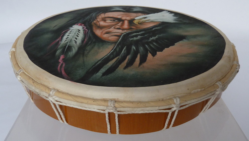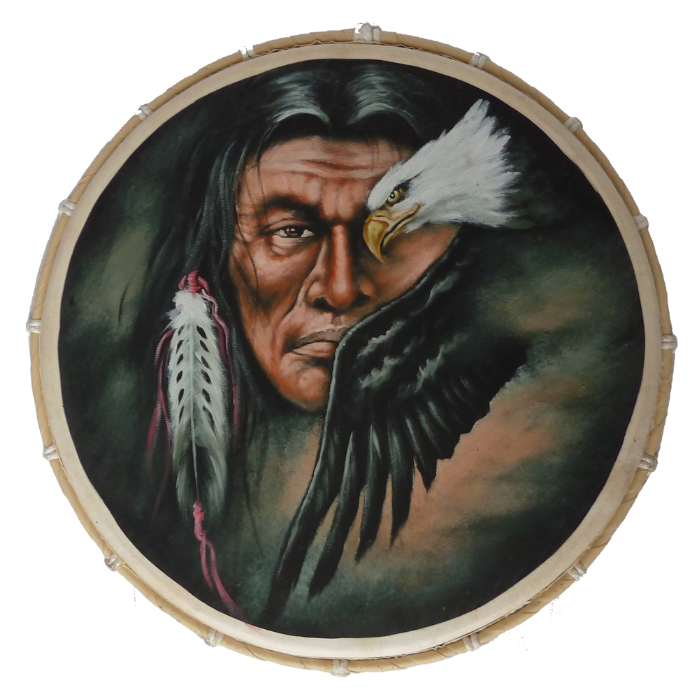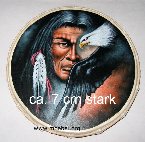 Schamanische, flache Trommel, Rahmentrommel mit Adler und Indianer.