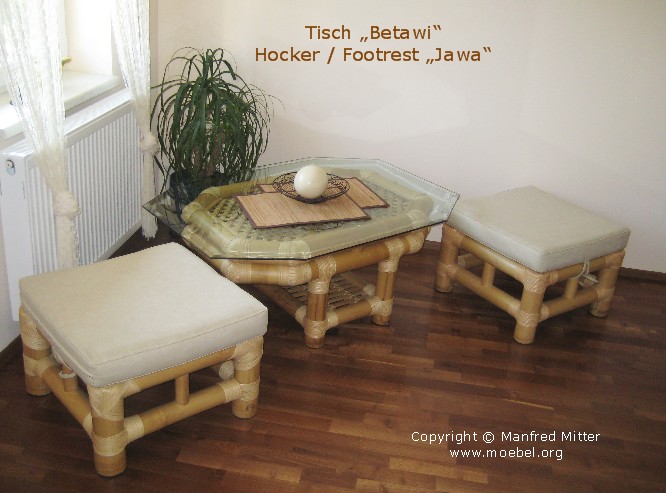 Gemütlich & bequem, Fauteuils / Sofas / Sitzgruppen Modell Sumatra, wie alle anderen Modelle ist auch das Sumatra mit Fußablage erhältlich (z. B. zur Verwendung als Lesesessel). Die Fußablage dieser Bambus-Sitzmöbel kann zudem ohne Polsterung auch als Tisch (Kaffeetisch, Beistelltisch) verwendet werden. Optional auch mit Glasplatte in Tischgröße oder mit rundum vorstehender Glasplatte um einen größeren Tisch zu haben. Zusätzlich ist die Fußablage auch ein Reserve-Sitzplatz