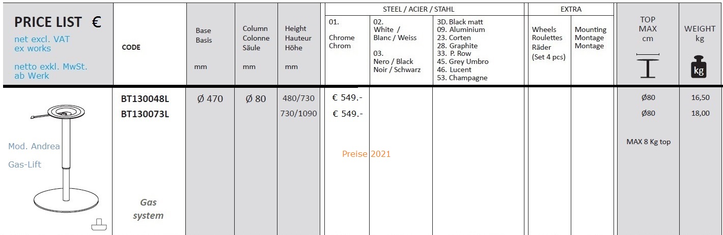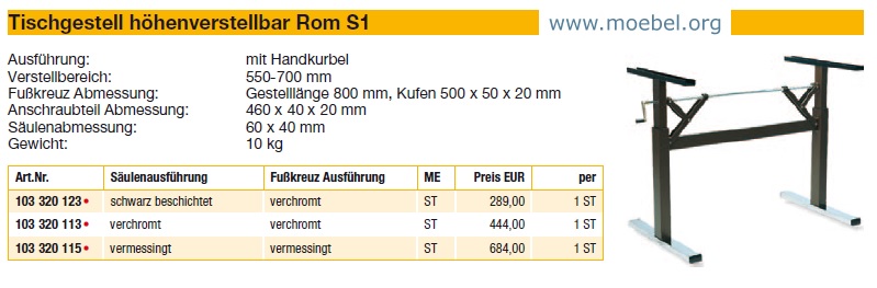 Höhenverstellbare Tischgestelle mit Gasdruckfeder oder Handkurbel, Richtpreise exkl. MwSt., größere Mengen und aktuelle Preise stets auf Anfrage!