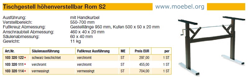 Höhenverstellbare Tischgestelle mit Handkurbel, Rom 1 und Rom 2: