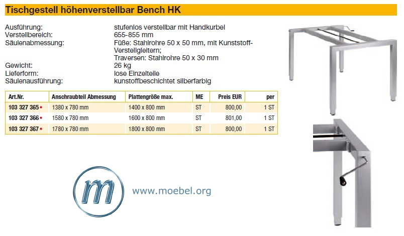 Stufenlos höhenverstellbare Tischgestelle mit Handkurbel, Modell Bench HK: