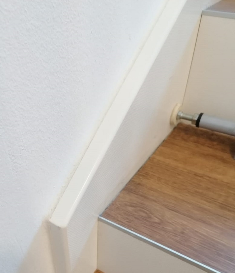 Feuerwehrschränke! Die Kante so einer Tischplatte (ohne Aluminium-Profil) kann kantig ausgeführt sein oder z. B. wie folgt aussehen (das Foto stammt von einer Randleiste auf einer Treppe, Boden aus Vinyl, Setzstufen und Randleisten aus wasserfester, lackierter Siebdruckplatte):