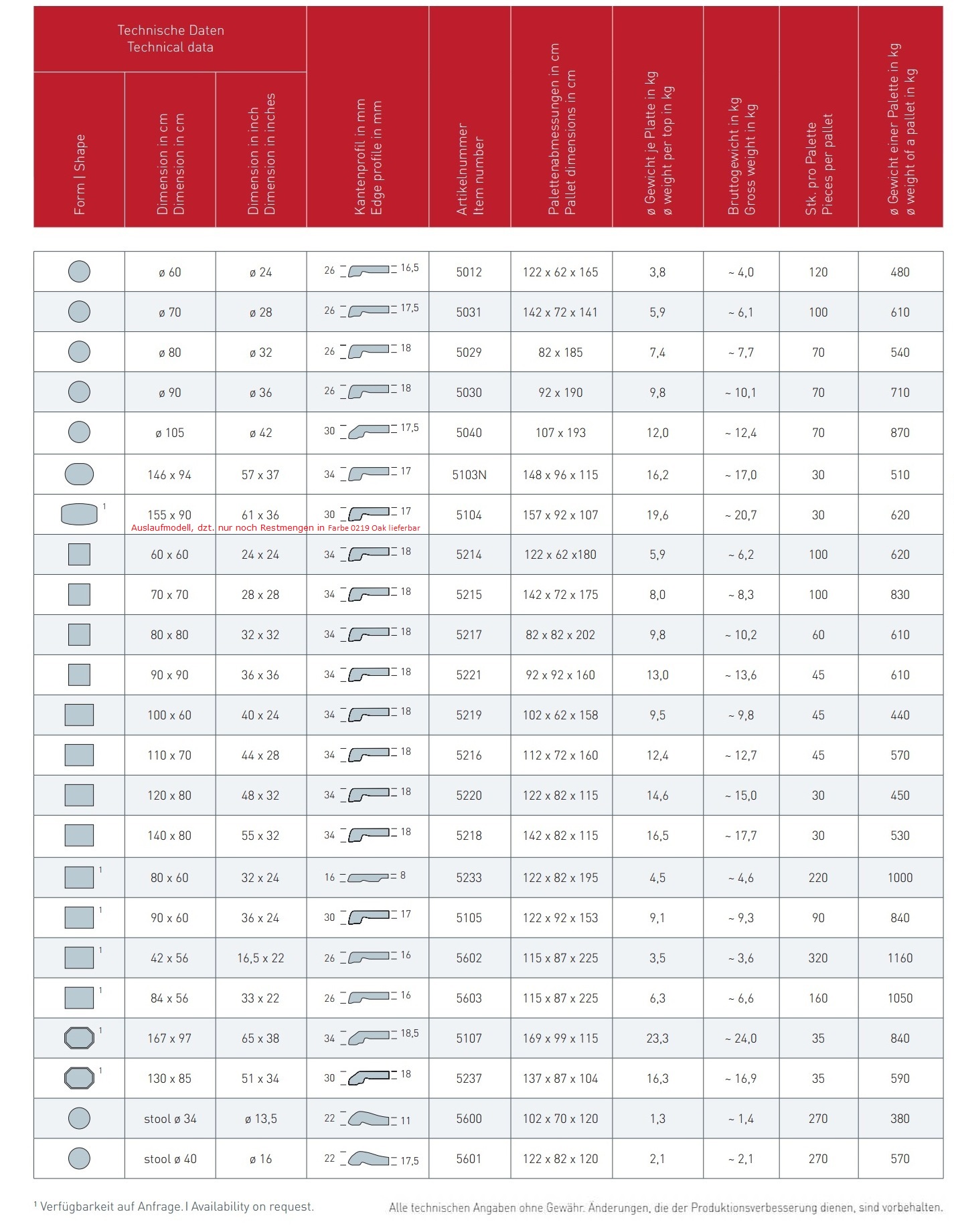 Die Kantenausführungen unserer wetterfesten TischplattenJe nach Abmessung sind die Tischplatten verschieden Stark, sowohl an der Kante also auch in der Fläche selber (also in der Mitte der Tischplatte), hier die Liste (Bilddatei verkleinert, die große ist hier): Beachten Sie bitte bzgl. Montage, dass die Stärken der Tischplatten unterschiedlich sind und dass für jede Stärke die Schraubenlänge entsprechend gewählt werden muss. Bei dünnen Platten empfiehlt sich ev. eine Montage mittels Kleber (je nach dem wie das Untergestell aussieht, kann man hier Konstruktionskleber oder Silikon verwenden). Alternativ kann vor dem Festschrauben am Untergestell die Tischplatte an der Unterseite auch aufgedoppelt werden, d. h. dort wo geschraubt wird zuerst eine zusätzliche, dünne wasserfeste Platte aufleimen auf die Tischplatte um mehr Halt (mehr Fleisch) für die Schrauben zu bekommen. Die Schraubenlänge ist entscheidend für den Halt der Tischplatte auf dem Untergestell. Größere Bilddatei (mit allen Details der Tischplatten) Preise